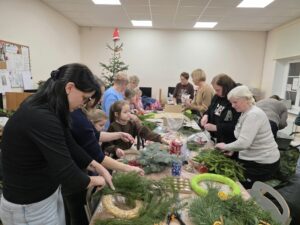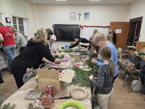 KGW Pruśce oraz służba liturgiczna działająca przy Kościele Parafialnym w Pruścach spotkały się by przygotować stroiki świąteczne na kiermasz, który odbędzie się w najbliższą niedzielę (14.12.25 r.).